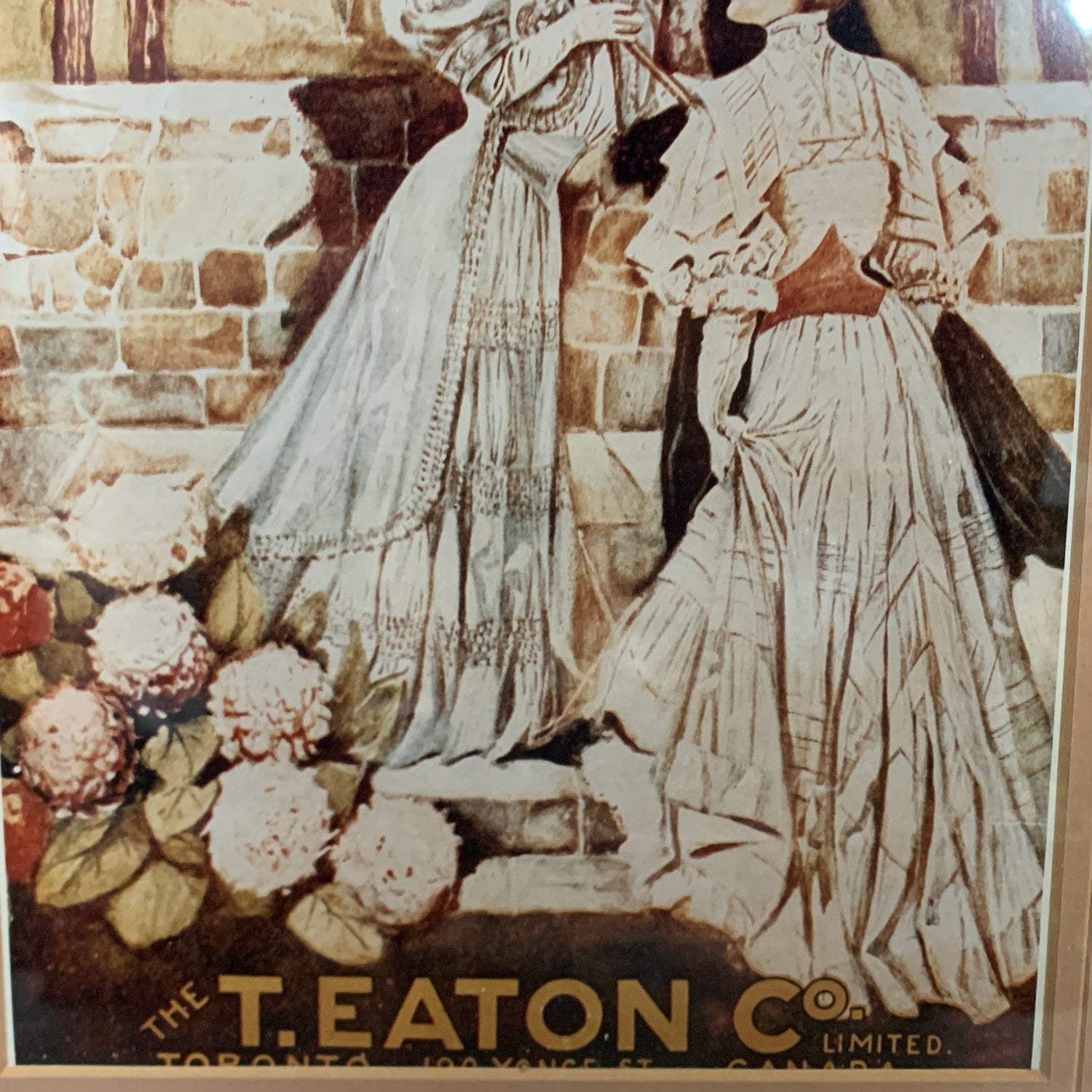 A vintage framed print of an Eaton's 1906 Spring Summer catalogue cover. The frame is wood with gold trim, the catalogue cover shows 3 women talking over a garden wall.