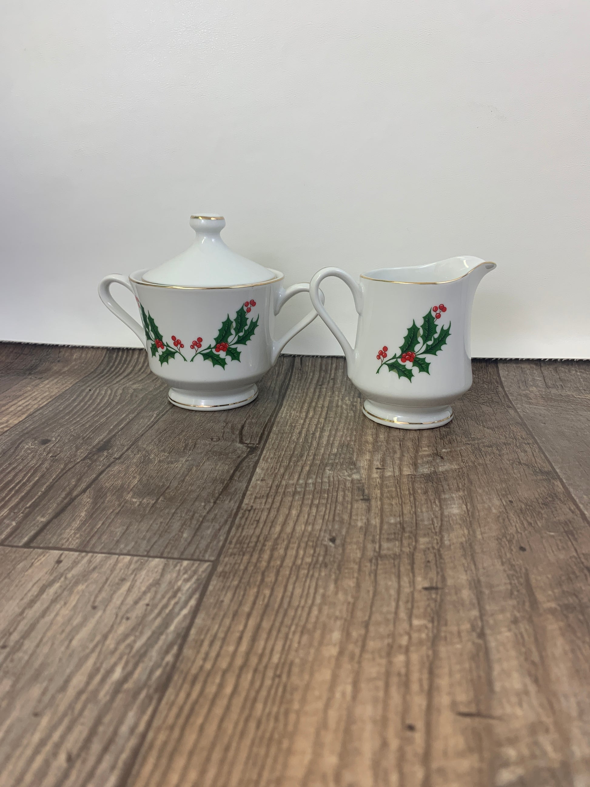A vintage cream and sugar set with a bright red and green Holly pattern and gold trim.