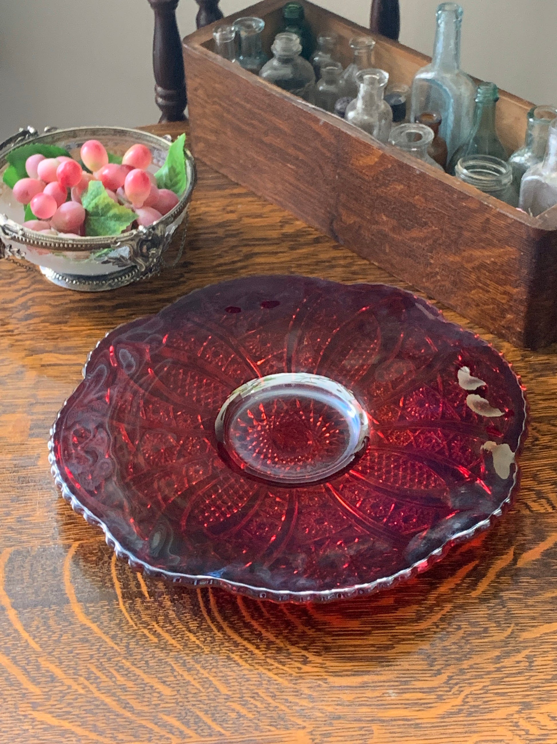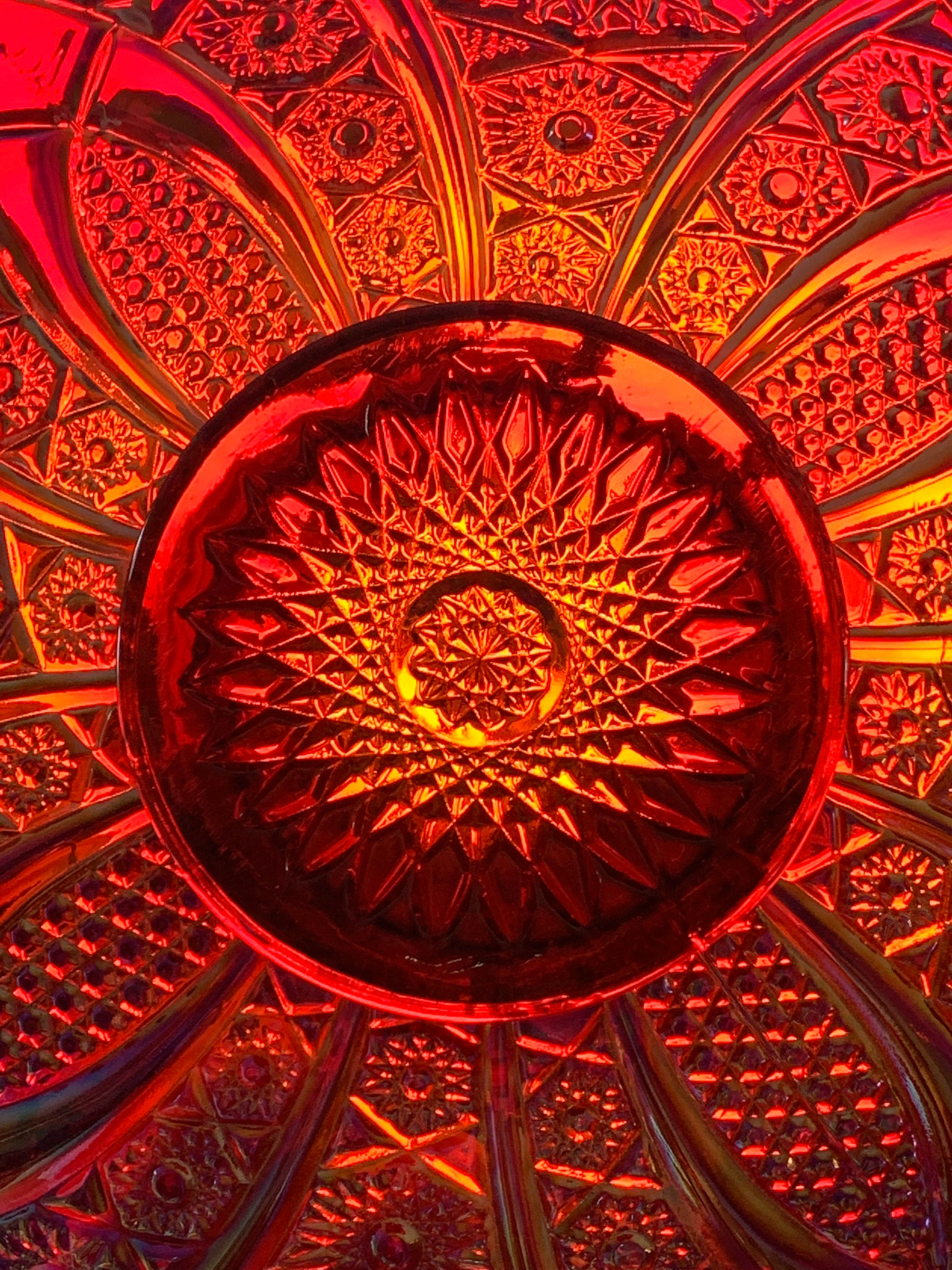 This large red platter changes colour depending on the angle from deep red to a golden rainbow. "Heirloom" made by the Indiana Glass Company.