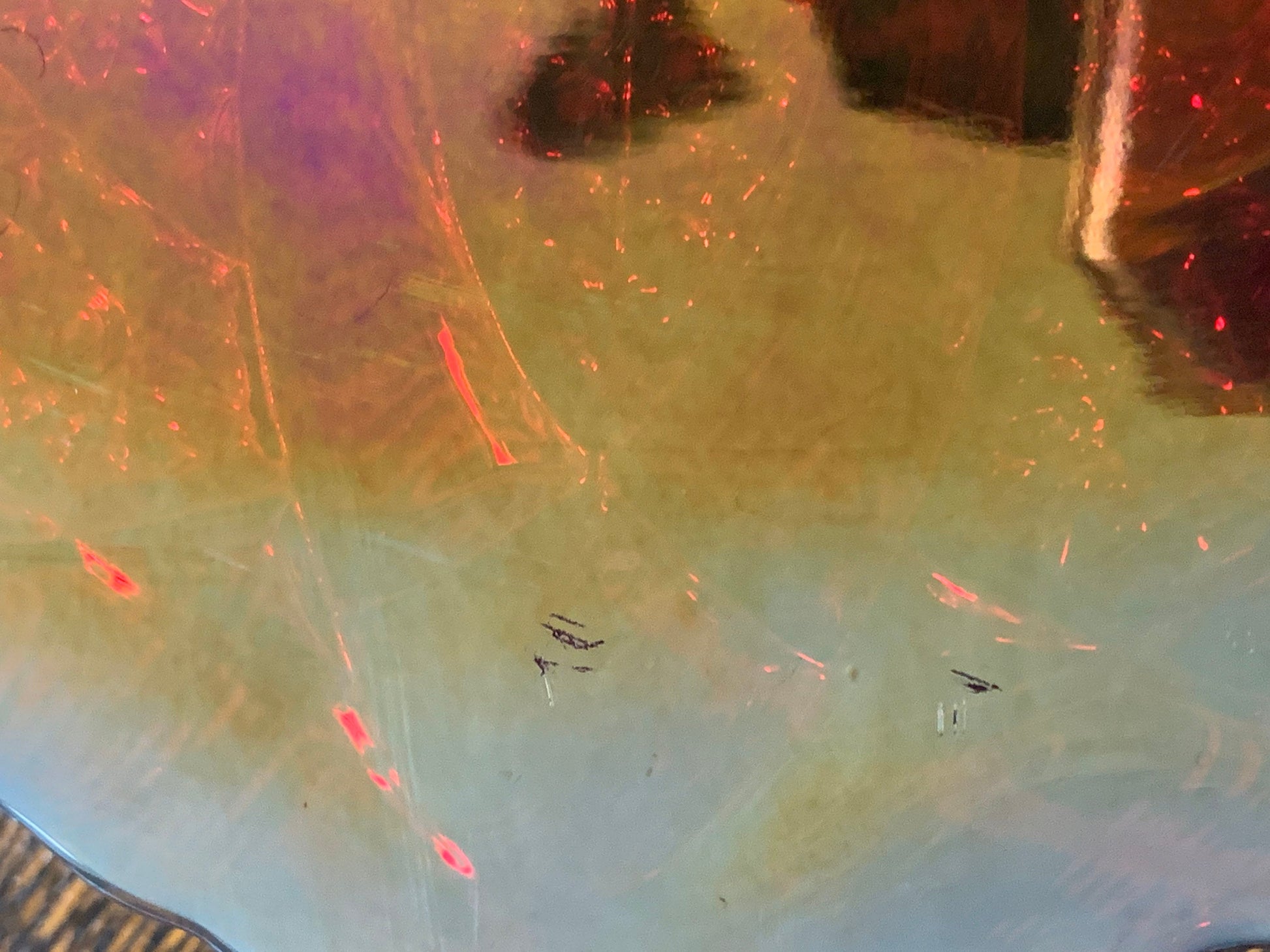 Condition is excellent, no chips or cracks. The iridescent coating is in good condition. A couple of minor scratches, please see photos