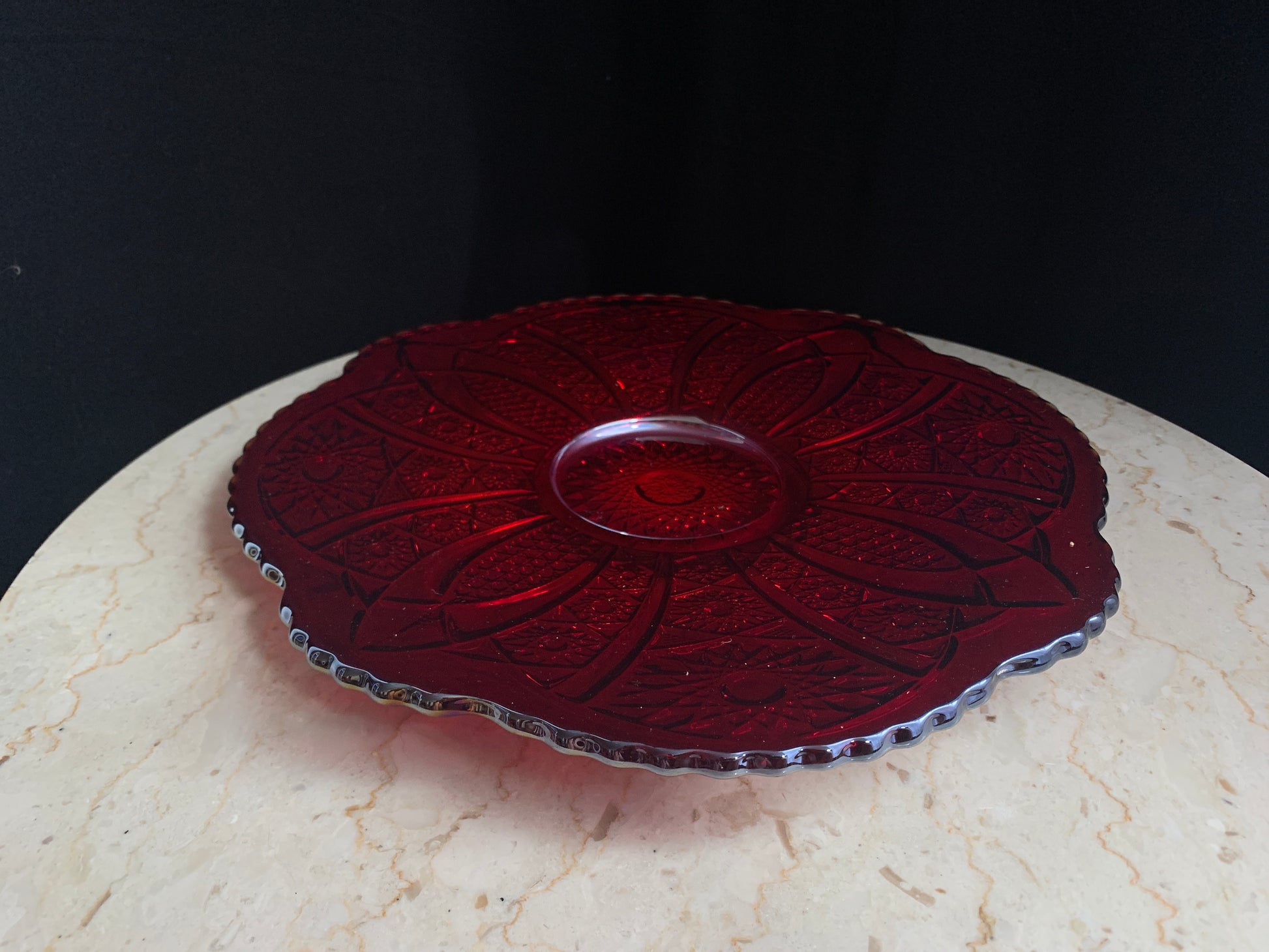 Indiana Glass Co "Heirloom" 11.5” platter in sunset red, the stunning colours in this piece resembling a sunset.
