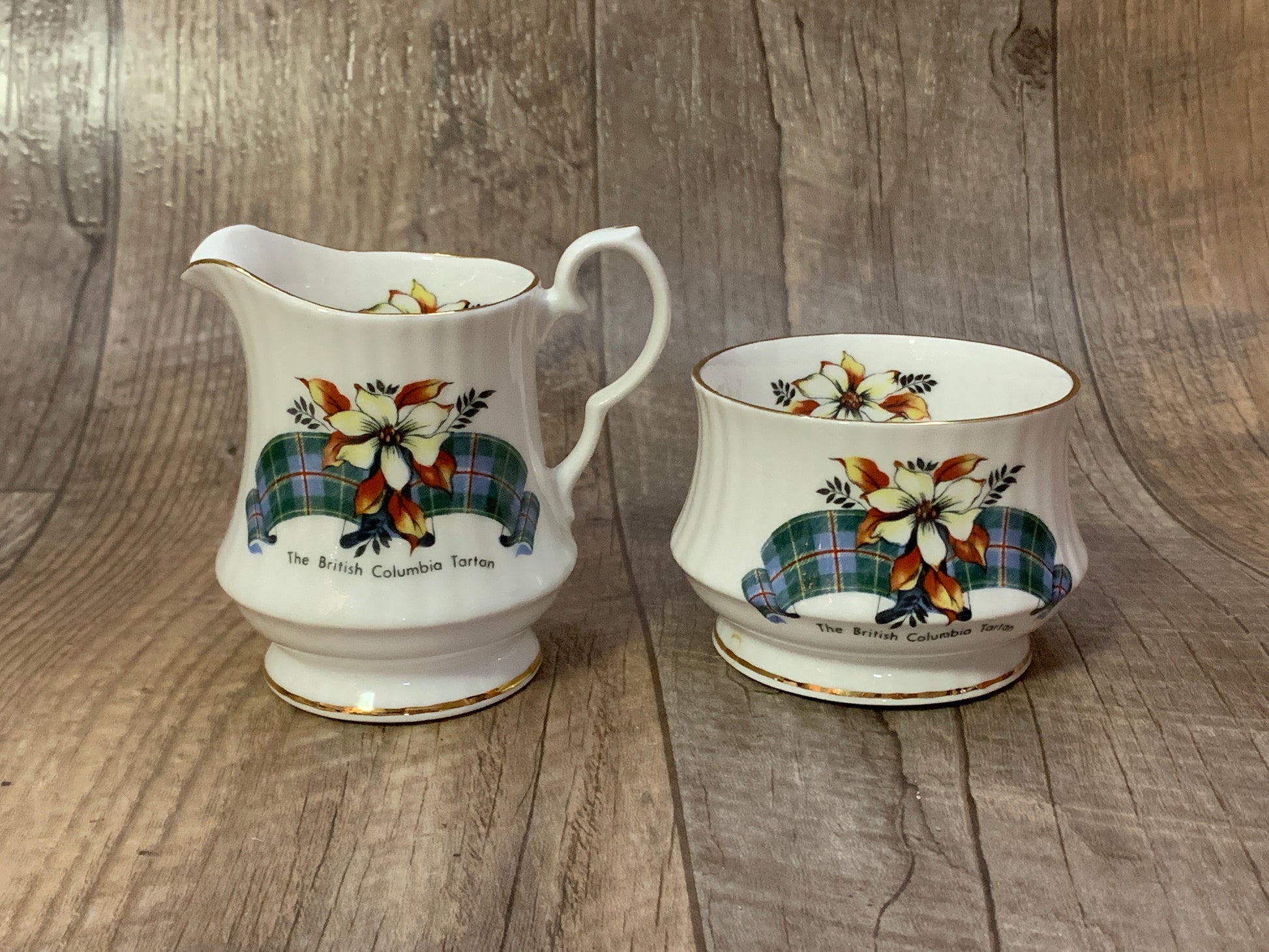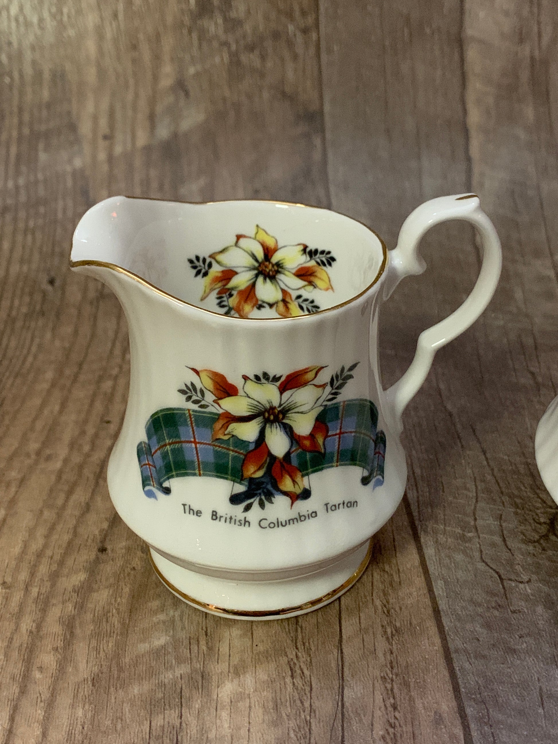 A vintage china cream and sugar set decorated with British Columbia tartan and provincial flowers.